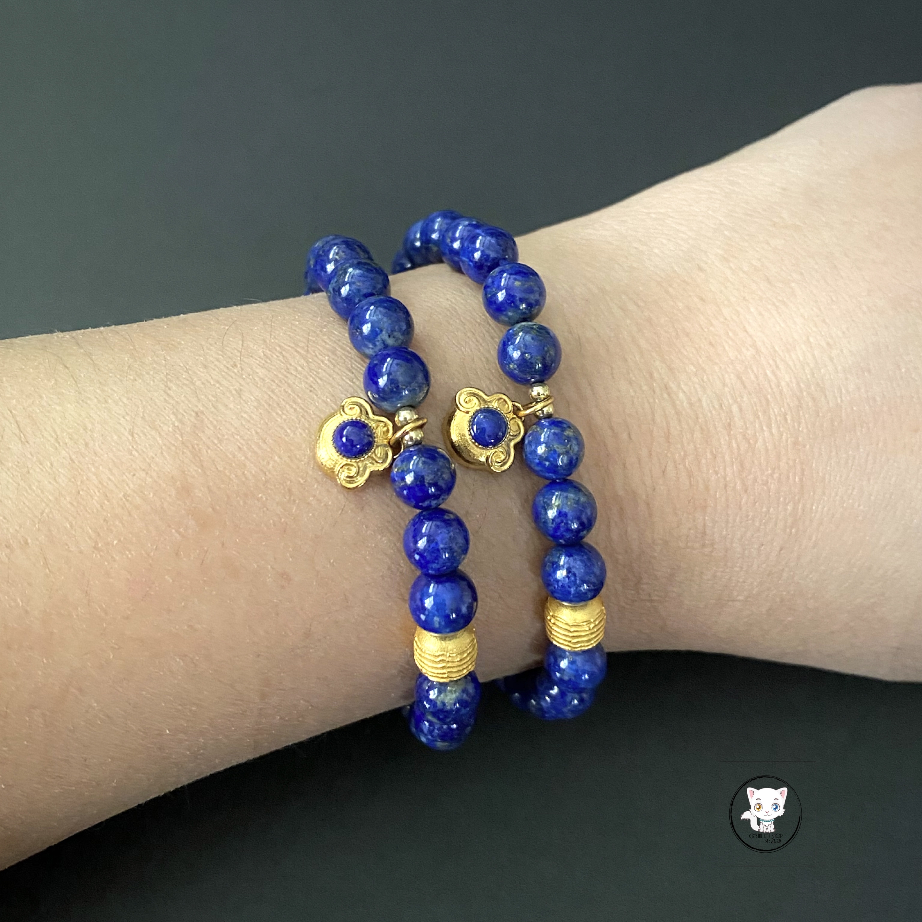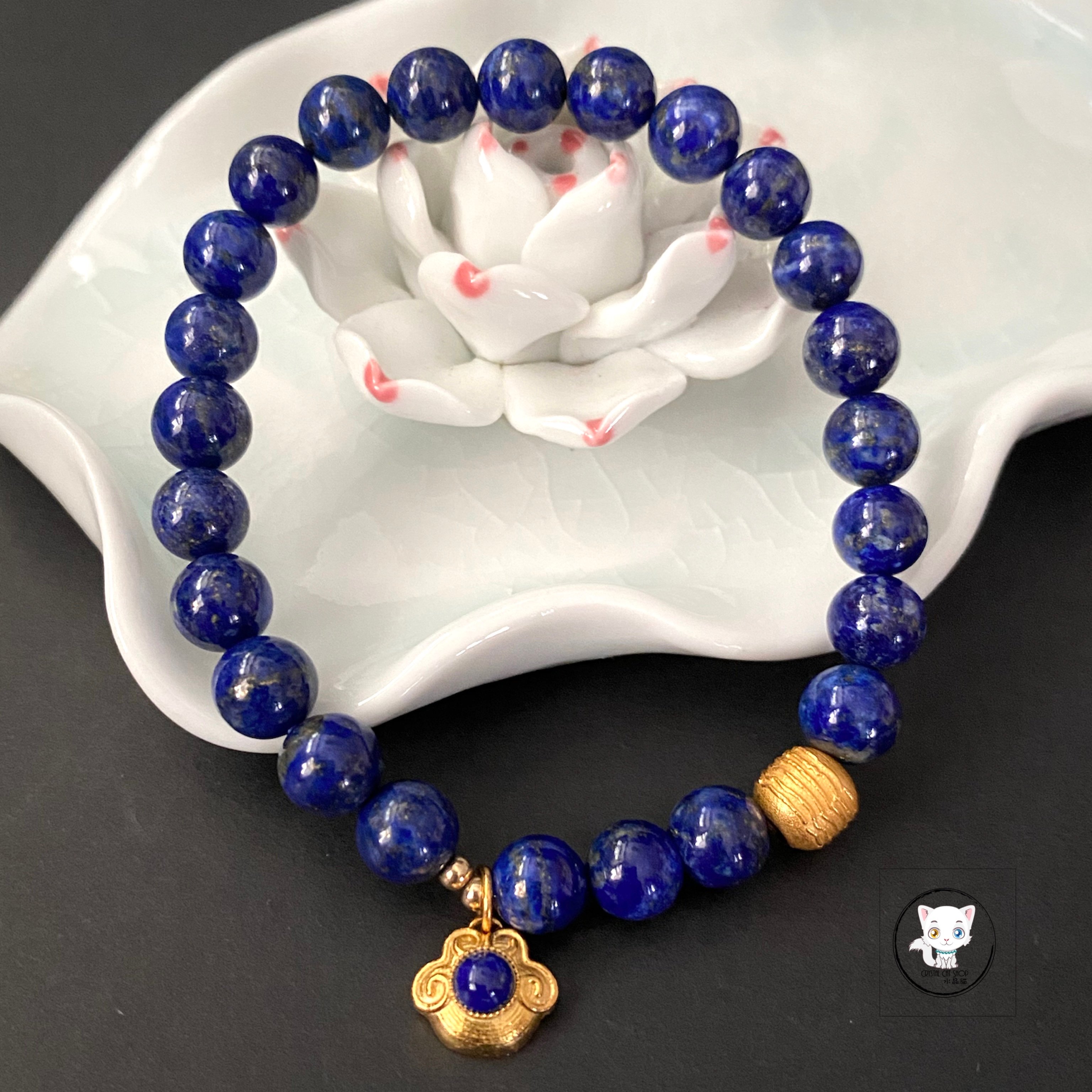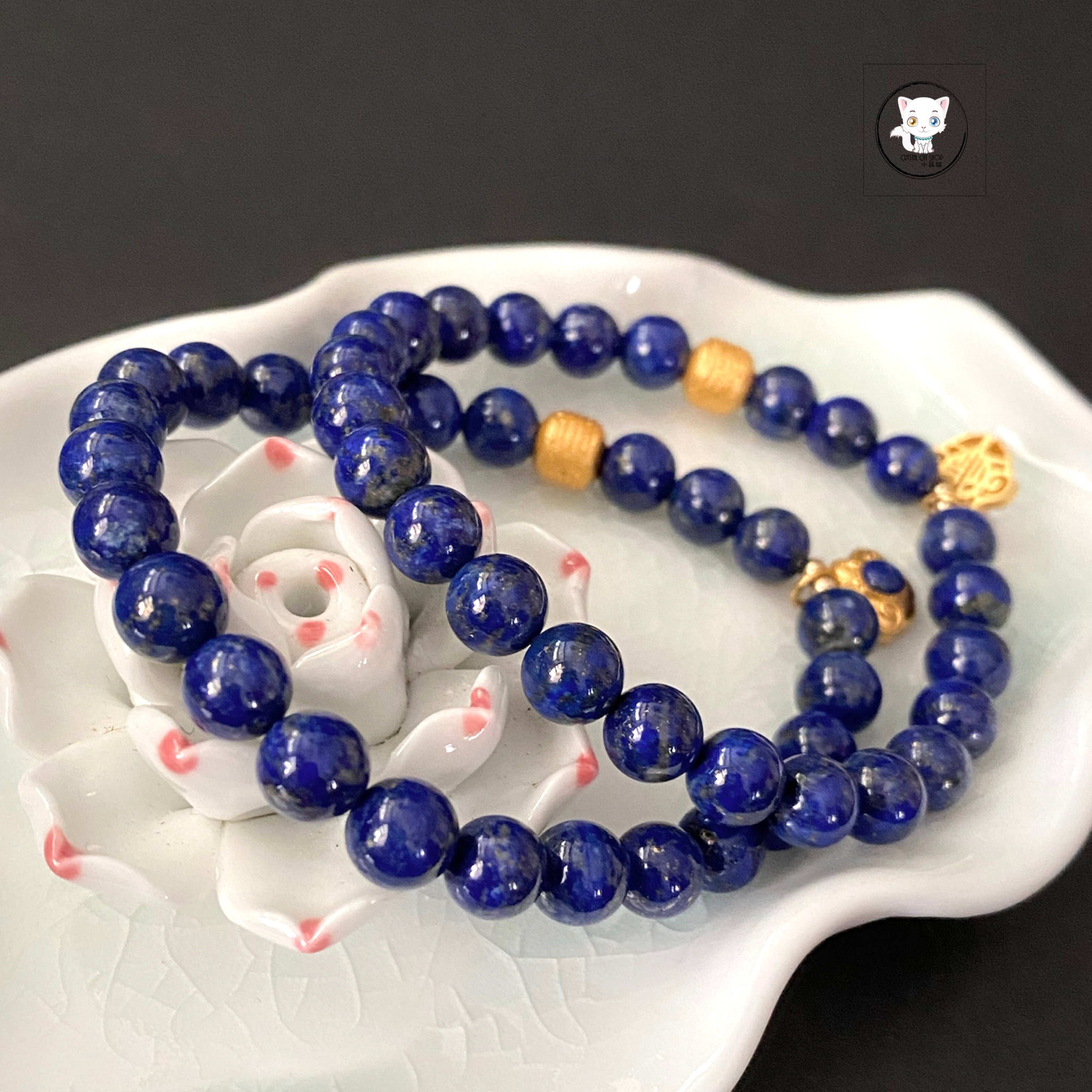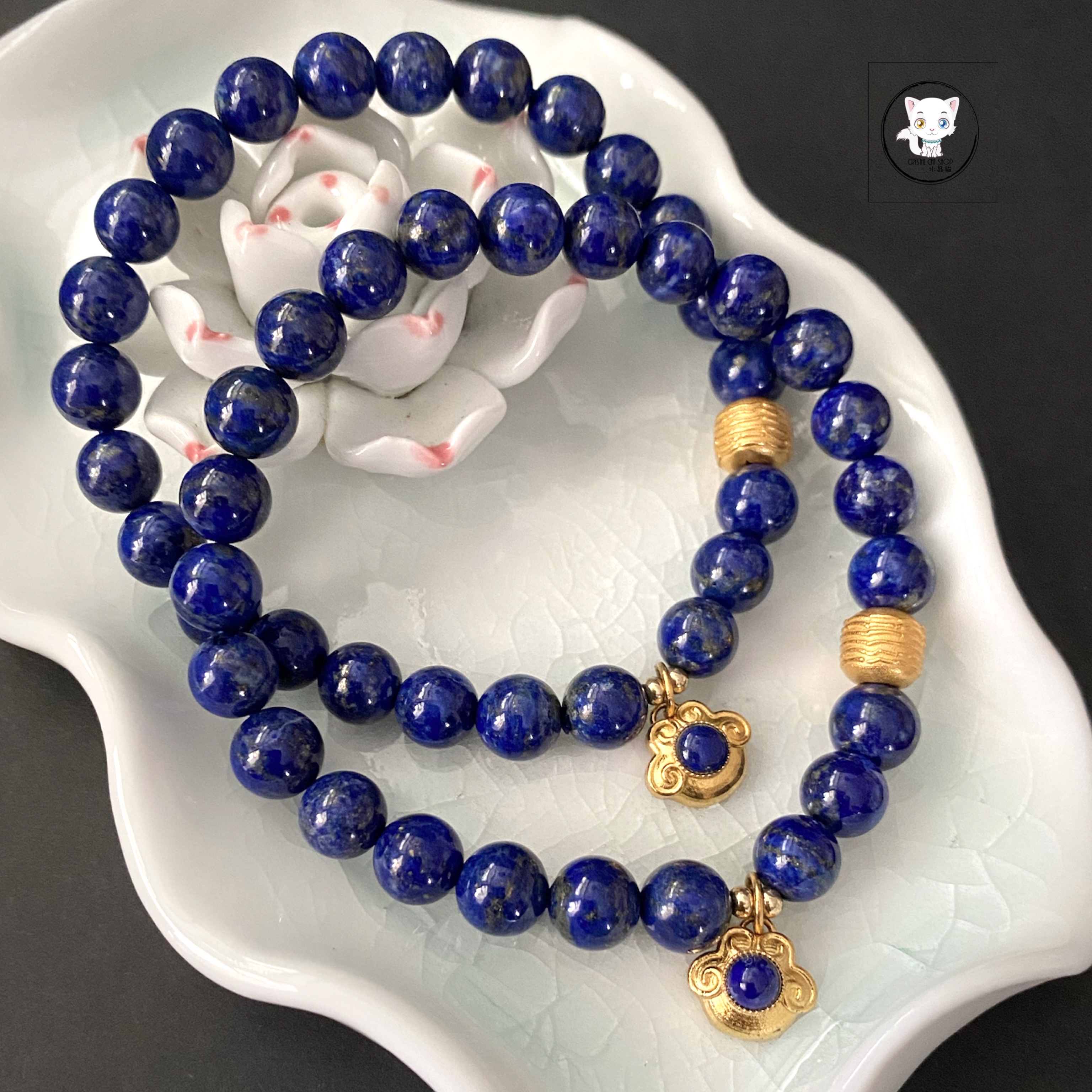 帝王青金石設計款手鏈 晶石尺寸:約7mm+ 適合手圍:約16cm 【青金石介紹】 💖 青金石(Lazurite / Lapis Lazuli)擁有不同層次的藍色,並含有金黃色(黃鐵礦)或白色(方解石)的內涵物。它在古埃及和中東國家的飾品中廣受喜愛,被視為「聖石」,只有高貴的法老和大祭司才能佩戴,象徵著地位和優雅。 💟 阿富汗青金石的歷史超過6,000年,呈現獨特的藍色。使用青金石時需心存尊敬與專注,以達到天人合一的境界。 ✅ 功效:青金石有助於改善眼部疲勞、喉嚨痛及呼吸道問題,並刺激甲狀腺,促進新陳代謝,對皮膚及循環系統有益。它還能舒緩過敏症狀,增強洞察力,平息怒氣與煩躁情緒。 💟 現在就來體驗青金石的美麗和益處,立即購買,發現這種珍貴寶石的奇妙之處❣️ 🔮 功效非精密科學,僅供參考。 ❇️ 質素如一,隨機發貨 ❇️ 📍天然水晶均有天然紋路,冰裂,棉絮或少許礦缺,如介意者,請注意。 ⚠️ 敬請留意 : 照片因拍攝光線或電腦螢幕設定不同,晶石顏色與實物可能會有輕微色差,顏色以實物為準。