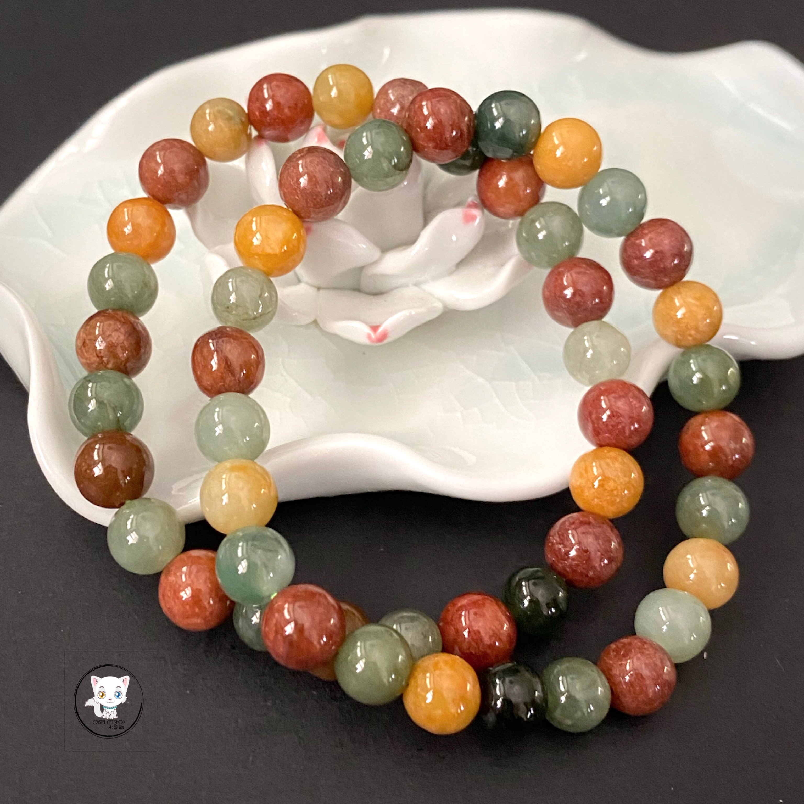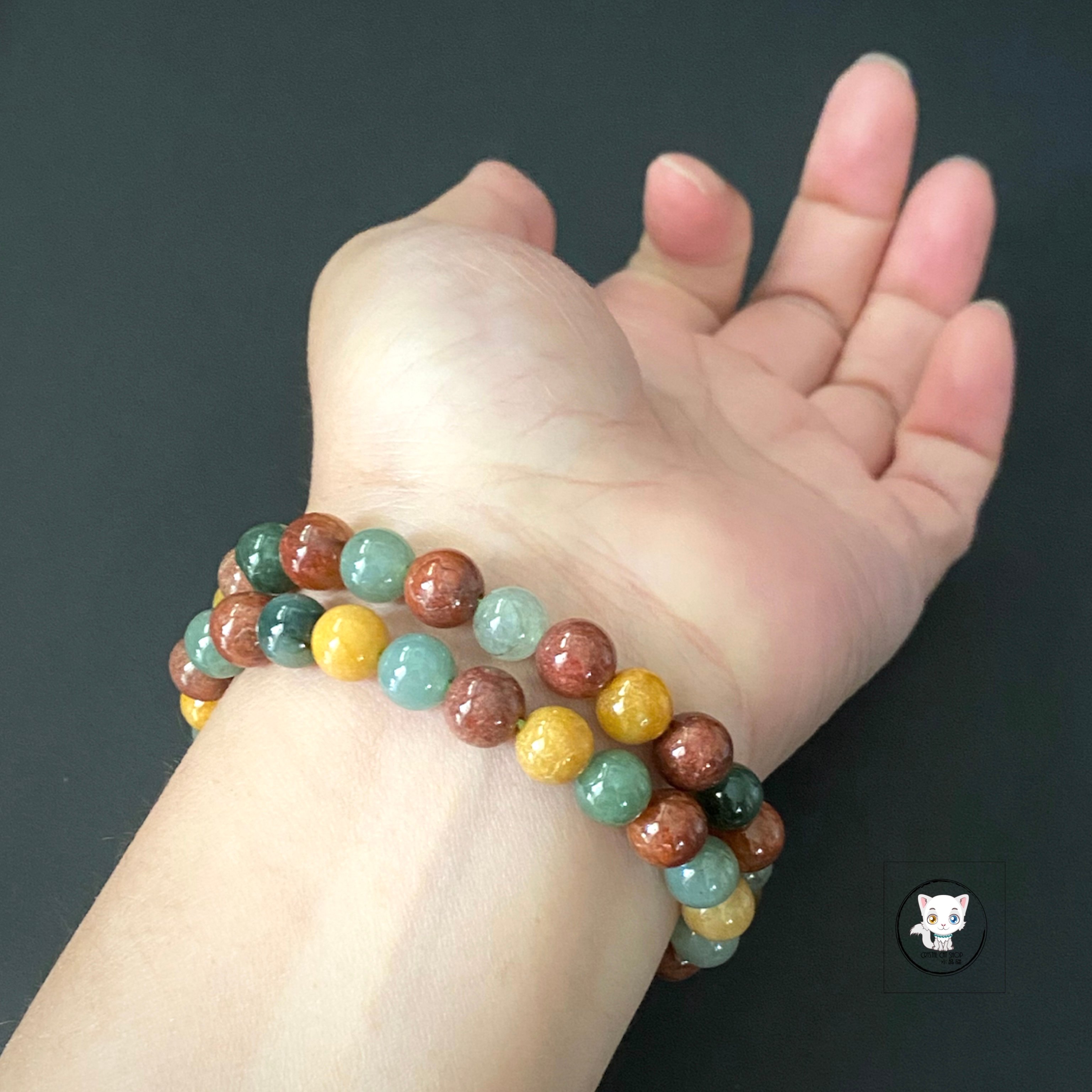 緬甸天然翡翠手鏈 晶石尺寸:約8mm 適合手圍:約17cm 【翡翠介紹】 💖 翡翠(Jadeite)屬於輝石類,化學成分為矽酸鋁鈉(NaAlSi2O6),並在低溫高壓的變質岩層中形成。它的主要成分是矽酸鋁鈉,當寶石礦中含有超過50%的矽酸鋁鈉時,才被視為翡翠。通常伴生於藍閃石、白雲母、硬柱石、霰石和石英。翡翠的莫氏硬度在6.5至7之間,比重在3.25至3.35之間,熔點介於900至1000 °C。 💟 翡翠的顏色取決於含有的鉻元素,可能呈現白色或綠色,其中白色泛綠的翡翠最常見,而祖母綠色的翡翠則更為珍貴。 ✅ 功效: 翡翠被公認為能夠避邪、護身、招財,並帶來永恆、長壽的能量。佩戴翡翠能夠為您帶來開心和快樂的正能量,將其視為一種護身符是廣為接受的。 💡 與其他玉石不同,翡翠不需要消磁或淨化,但最重要的是要「養玉」。所謂「養玉」即是將翡翠與身體緊密接觸:翡翠是一種有趣且有生命的活石頭。如果您的翡翠是天然且未經處理的,經常佩戴它並利用您的體溫去滋養它,您將會發現翡翠玉石的透明度會隨著時間變得更加亮麗。 🔮 功效非精密科學,僅供參考。 ❇️ 質素如一,隨機發貨 ❇️ 📍天然水晶均有天然紋路,冰裂,棉絮或少許礦缺,如介意者,請注意。 ⚠️ 敬請留意 : 照片因拍攝光線或電腦螢幕設定不同,晶石顏色與實物可能會有輕微色差,顏色以實物為準。