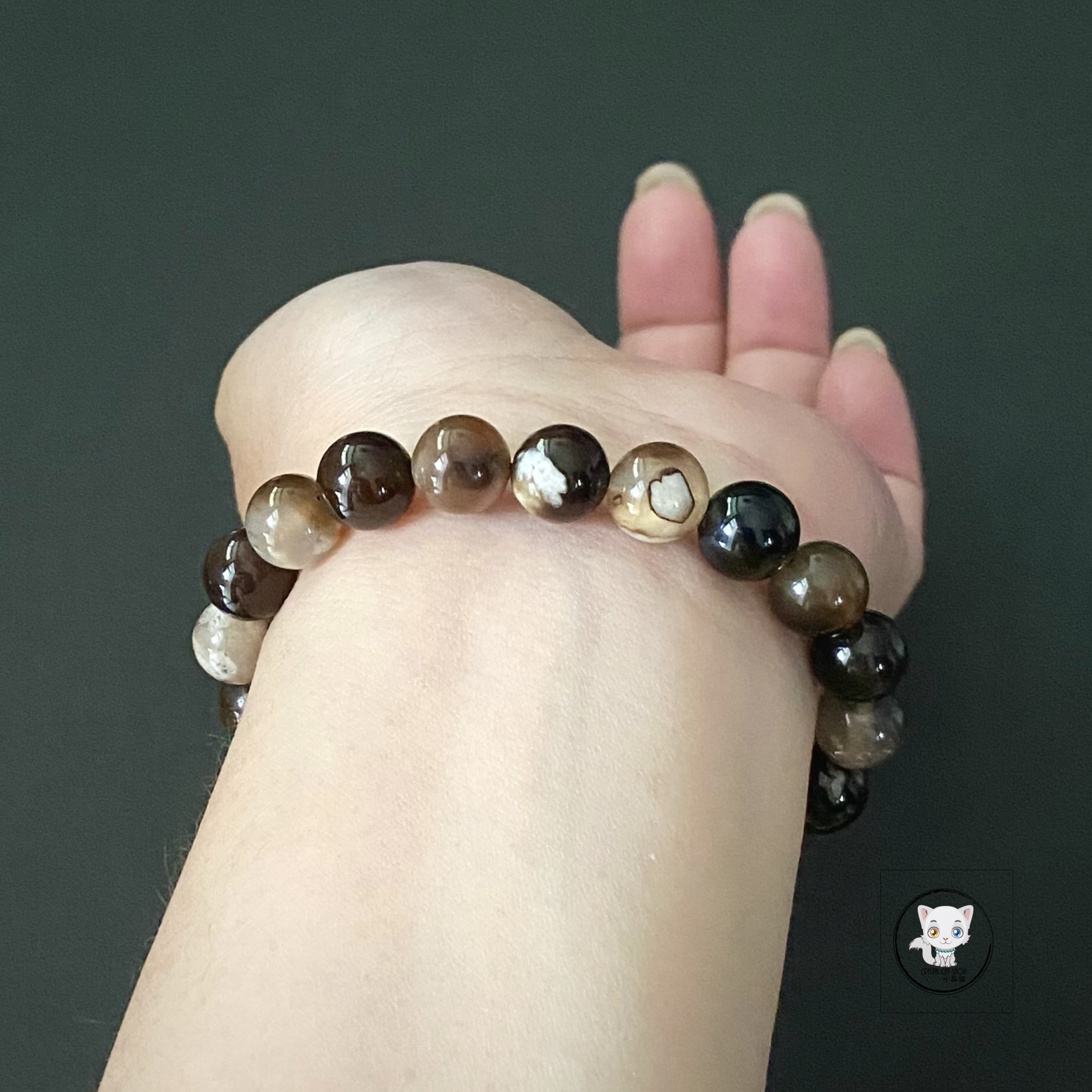 天然黑櫻花瑪瑙手鏈 晶石尺寸:約9.5mm 適合手圍:約16.5cm 【晶石介紹】 💖 瑪瑙-Agate品種繁多,整個瑪瑙家族十分龐大。其中一種瑪瑙充滿溫柔優雅之美,深受女仕們喜愛,就是櫻花瑪瑙 - Blossoms Agate🌸。 💟 櫻花瑪瑙被視為寶石中的「第三眼」,靈性十足,象徵友善與愛心,也代表希望。櫻花瑪瑙晶體內含粉白色、猶如朵朵盛開之櫻花的共生礦,每枝形態獨一無二,為人帶來溫柔細膩的內涵,會令人要停下來慢慢欣賞佢嘅美。 ✅ 瑪瑙具有多重好處,可以幫助人們達到身心放鬆和提升睡眠質量的效果。它被認為具有平衡、穩定和保護的特性,可以在生活中發揮正面的作用。同時,瑪瑙也被視為護身符和辟邪物,能夠帶來平安和保護的功效。佩戴瑪瑙可以幫助保持身心的和諧,增強愛、忠誠和勇氣等正面情緒。 🔮功效非精密科學,僅供參考。 ❇️質素如一,隨機發貨❇️ 📍天然水晶均有天然紋路,冰裂,棉絮或少許礦缺,如介意者,請注意。 ⚠️敬請留意:照片顏色可因不同場景或室內白燈光下拍攝,所有晶石已極力忠於原色,但由於電腦螢幕設定不同,晶石呈現顏色均稍為有微色差,因此顏色以實物為準。