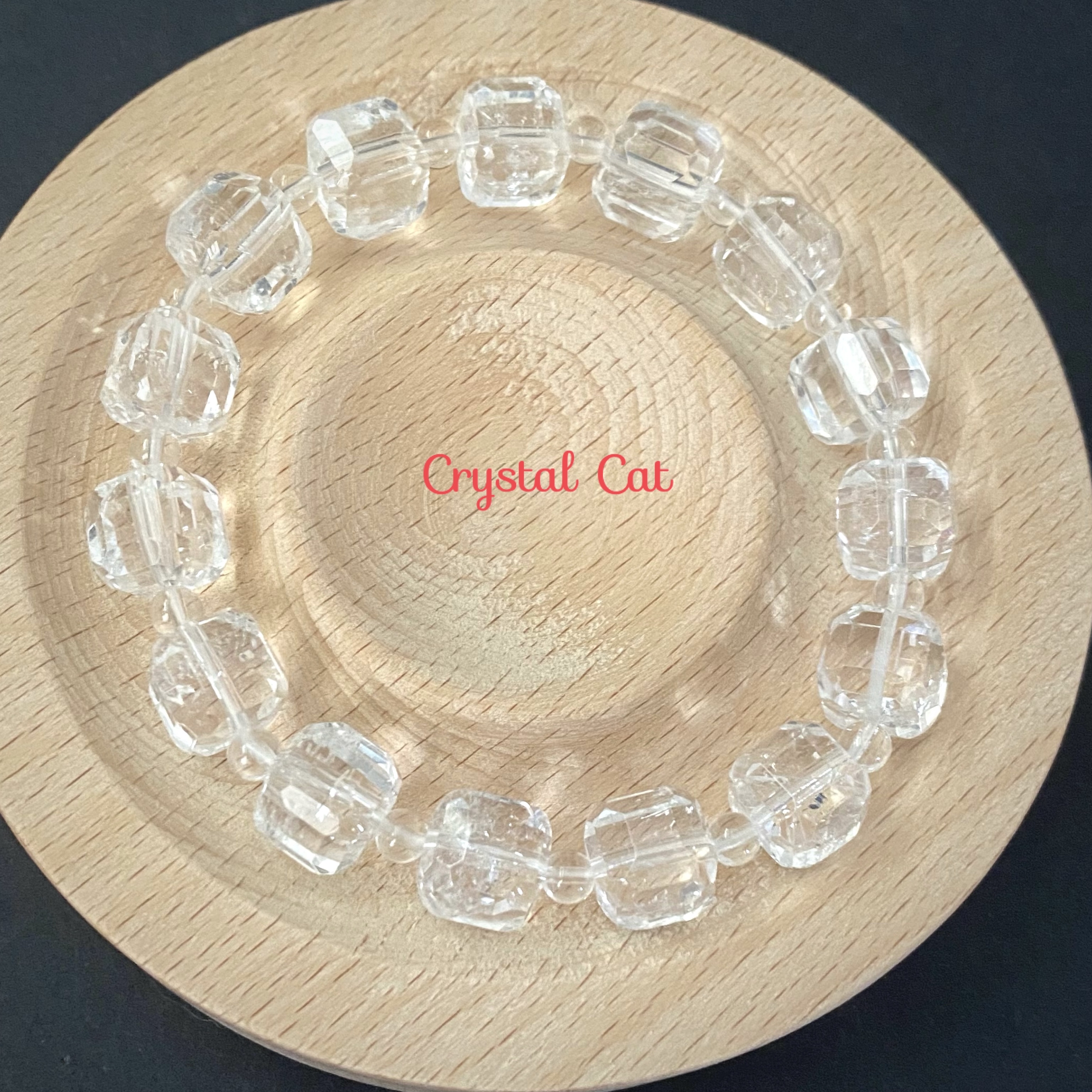 彩虹白水晶方糖手鏈 晶石尺寸:約9.5mm+ 適合手圉:約17.5cm 【晶石介紹】 彩虹白水晶是把天然白水晶中較多冰裂的位置切割出來,天然晶石形成期間,因礦洞環境內之溫度、地層自然活動(例如地震)產生的壓力、各種礦物質的分佈等因素,生長出來的晶石或多或少均帶有天然白棉、石紋、雜質、冰裂紋、礦缺等。冰裂紋就覺像晶體中的多塊「小鏡子」,當有光線照射便折射出多道彩虹,比沒有冰裂的位置更閃閃發亮,實物更美。 白水晶又名「王者水晶」、「官運石」,晶瑩通透的白水晶是大地神奇的贈禮之一,代表平衡、圓滿、主健康、清除負能量。 白水晶能量是水晶中最具有代表性,功能最多,應用最廣泛。 ✅ 功效: 1)白水晶又稱「官運石」,可以升官旺運、息災增益、活絡親情和友情。 2)白水晶對應人體七輪中的「頂輪」,即頭頂正中位置,可將體內之病氣、黑氣,從腳底排出,使人頭腦清晰、精神爽利,對事業與健康非常有幫助。 3)白水晶是所有熱能 (紅、橙、黃、綠、藍、靛、紫所有光色) 的綜合體,具有淨化輻射,吸收電磁波的神奇功效。 4)白水晶在光線中會產生持續、穩定的震盪,因此白水晶幫助使人頭腦清晰、增強記憶力和理解力,最適合考生佩帶,但應避免放置白水晶於睡床附近,否則你會容易失眠。 🔮功效非精密科學,僅供參考。 ❇️質素如一,隨機發貨❇️ 📍天然水晶均有天然紋路,冰裂,棉絮或少許礦缺,如介意者,請注意。 ⚠️敬請留意:照片顏色可因不同場景或室內白燈光下拍攝,所有晶石已極力忠於原色,但由於電腦螢幕設定不同,晶石呈現顏色均稍為有微色差,因此顏色以實物為準。