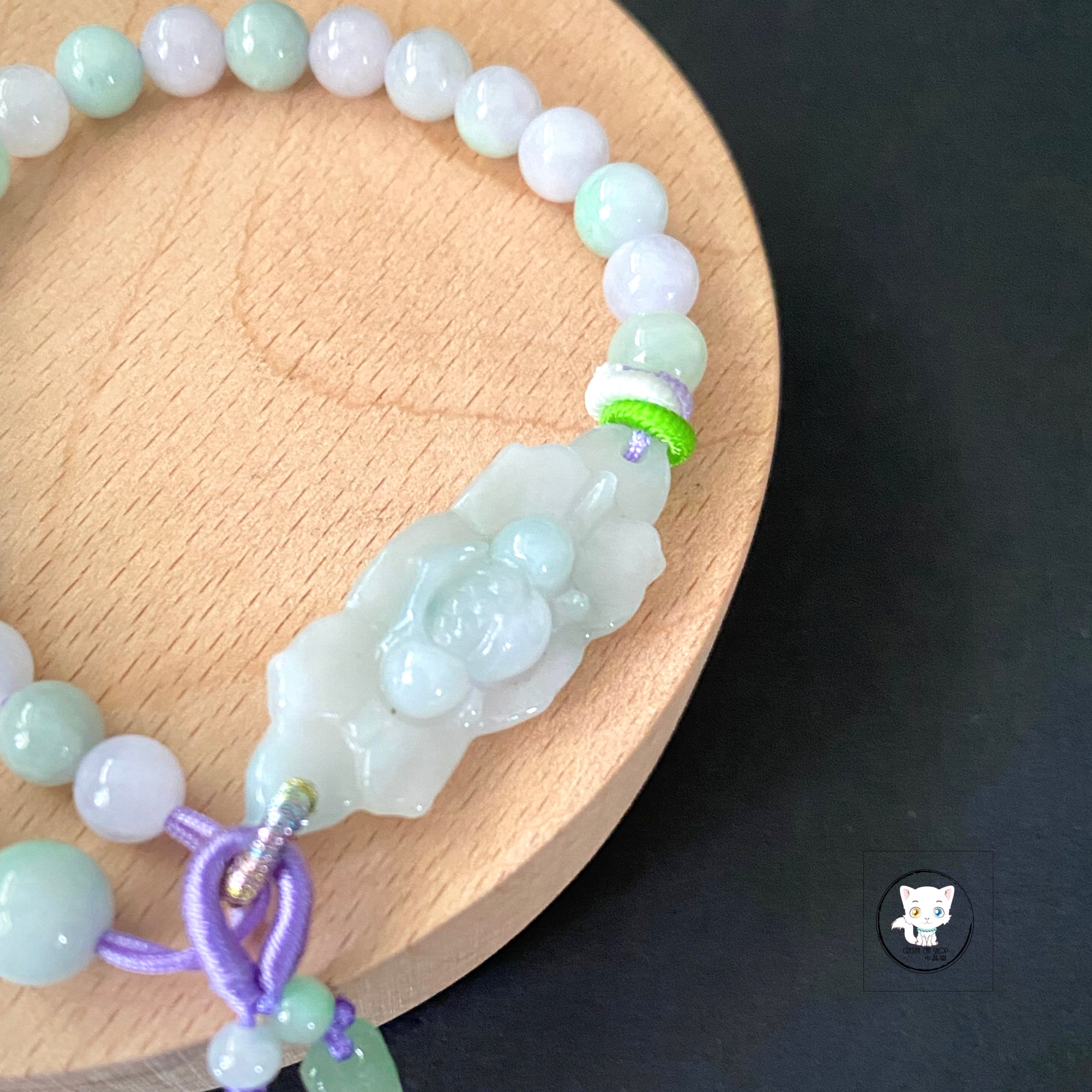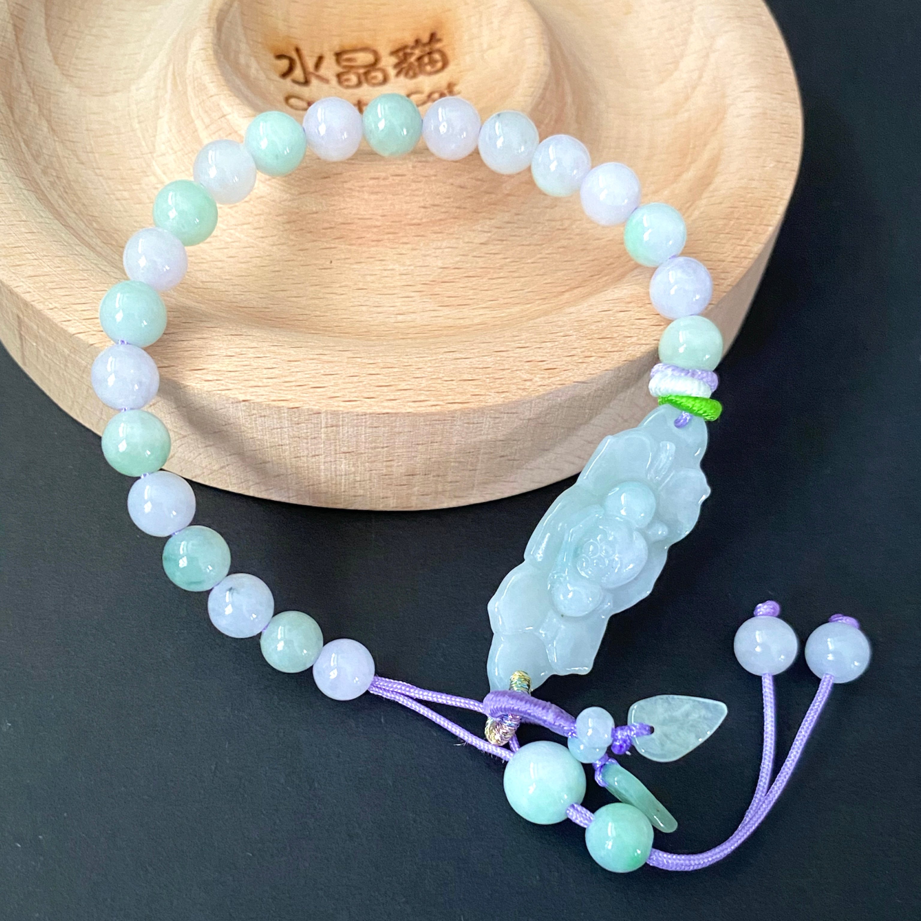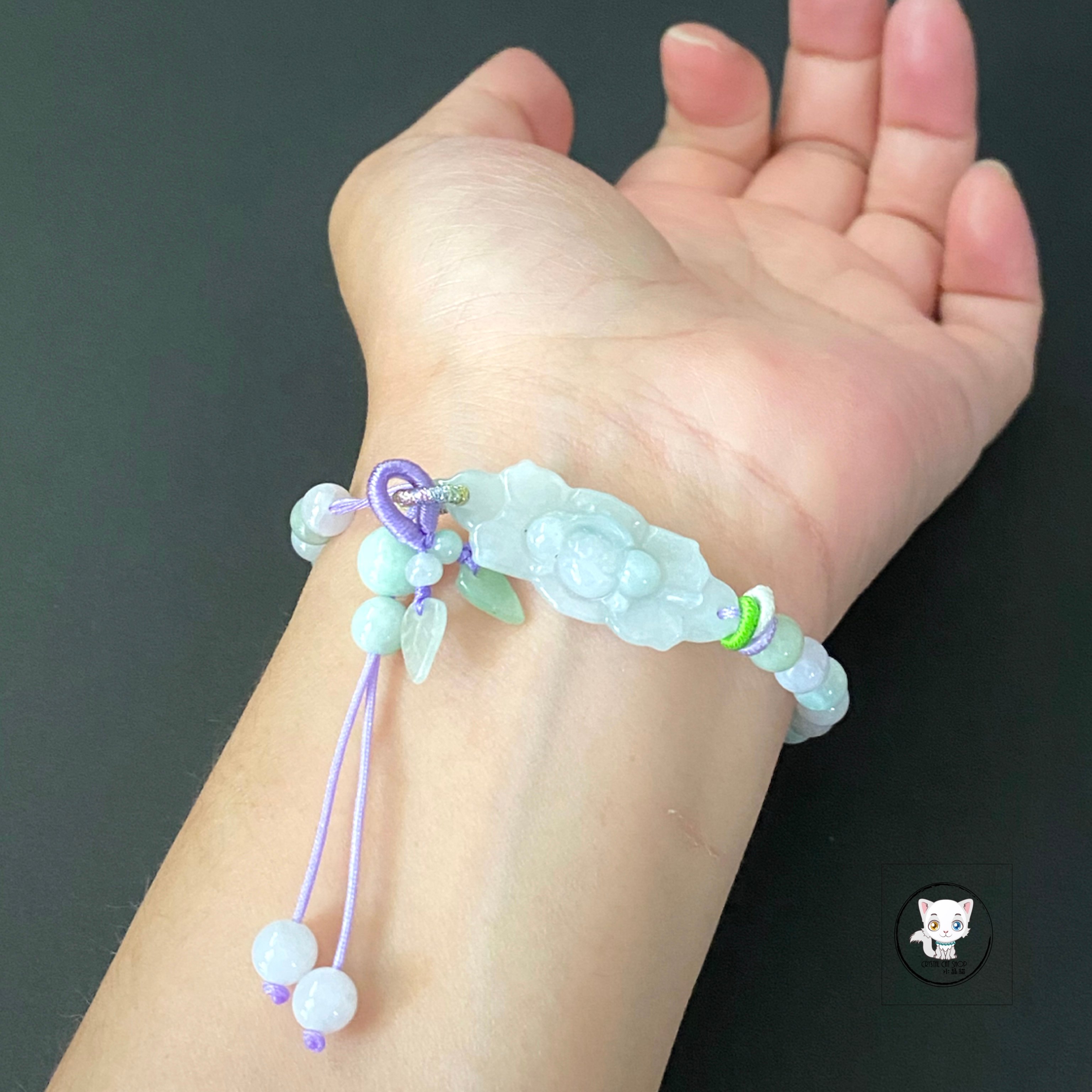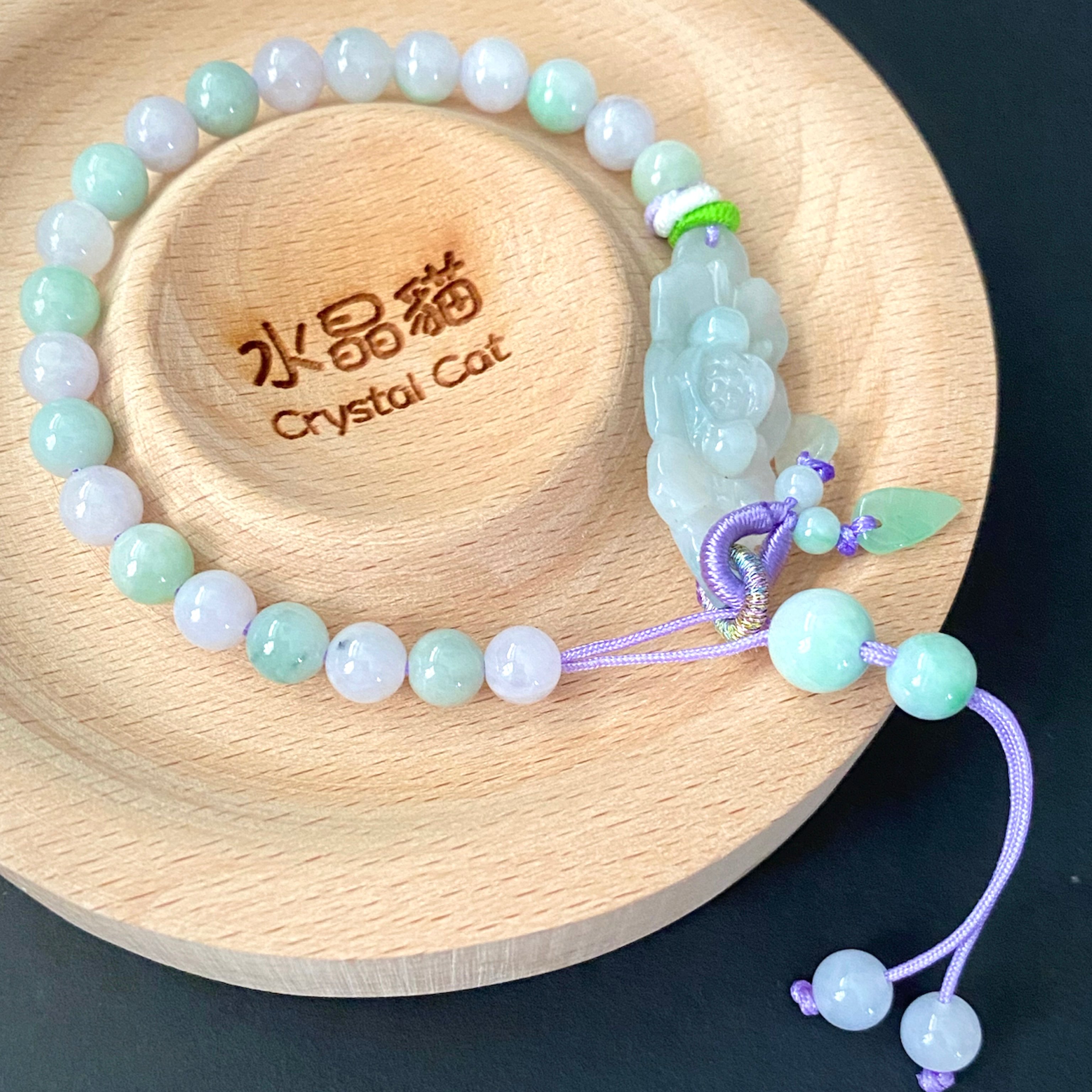 緬甸天然翡翠雕刻小花手繩 晶石尺寸:約6mm 適合手圍:約13-17cm 【翡翠介紹】 💖 翡翠(Jadeite)屬於輝石類,化學成分為矽酸鋁鈉(NaAlSi2O6),並在低溫高壓的變質岩層中形成。它的主要成分是矽酸鋁鈉,當寶石礦中含有超過50%的矽酸鋁鈉時,才被視為翡翠。通常伴生於藍閃石、白雲母、硬柱石、霰石和石英。翡翠的莫氏硬度在6.5至7之間,比重在3.25至3.35之間,熔點介於900至1000 °C。 💟 翡翠的顏色取決於含有的鉻元素,可能呈現白色或綠色,其中白色泛綠的翡翠最常見,而祖母綠色的翡翠則更為珍貴。 ✅ 功效: 翡翠被公認為能夠避邪、護身、招財,並帶來永恆、長壽的能量。佩戴翡翠能夠為您帶來開心和快樂的正能量,將其視為一種護身符是廣為接受的。 💡 與其他玉石不同,翡翠不需要消磁或淨化,但最重要的是要「養玉」。所謂「養玉」即是將翡翠與身體緊密接觸:翡翠是一種有趣且有生命的活石頭。如果您的翡翠是天然且未經處理的,經常佩戴它並利用您的體溫去滋養它,您將會發現翡翠玉石的透明度會隨著時間變得更加亮麗。 🔮 功效非精密科學,僅供參考。 ❇️ 質素如一,隨機發貨 ❇️ 📍天然水晶均有天然紋路,冰裂,棉絮或少許礦缺,如介意者,請注意。 ⚠️ 敬請留意 : 照片因拍攝光線或電腦螢幕設定不同,晶石顏色與實物可能會有輕微色差,顏色以實物為準。
